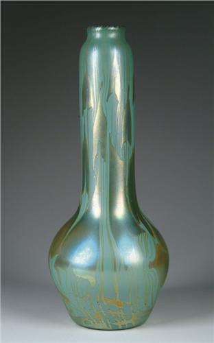 MONUMENTAL TIFFANY VASE. Spectacular Tiffany vase has pulled heart and vine design in gold iridescence against a seafoam green background. The magnificent vase stands 21 in. t and is signed on the underside "Louis C. Tiffany Favrile" and "W5134". The vase comes with a fitted blue velvet covered presentation box. The box is an after market addition, but a nice compliment to the vase. CONDITION: Very minor scratch to body of vase, otherwise very good to excellent. 5-61123