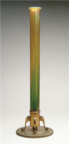 MONUMENTAL TIFFANY VASE. Outstanding Tiffany vase has tall slender cylinder insert with green pulled leaf design against a beautiful gold iridescent background with flashes of red. Insert rests within large bronze base with four legs attaching the vase holder to a round bronze disk. Base is finished in bright gold patina. Signed on the underside "Tiffany Studios New York 715". Insert is also signed "LCT". SIZE: Overall height is 25-3/4 in. CONDITION: Very good to excellent. 5-61332