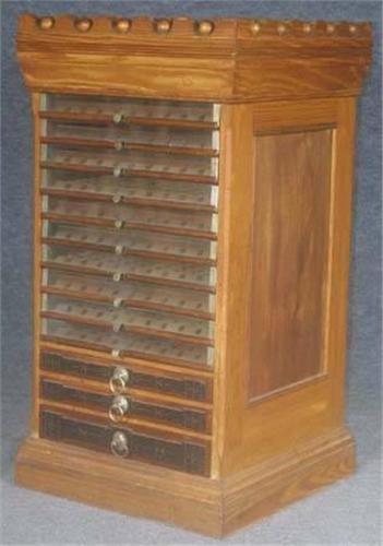 MONUMENTAL VICTORIAN (13) DRAWER SPOOL CABINET, all glass fronts are complete height:36 1/2",width:19 1/2" depth: 18"