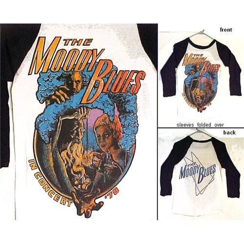 Moody Blues Concert T shirt dated 1978, a music collectible. This Moody Blues vintage tee shirt has bold fantasy design on front, navy blue long sleeves and neck band on white T shirt (shadows in photos). Moody Blues name on both front and back of tee shirt. Teen size 14 or 16. Very good used vintage condition, no labels. This is a genuine 30-year-old teen size tee shirt, not a recent repro using an older date. Music Industry Nostalgia collectors should not miss this wonderful music collectible.