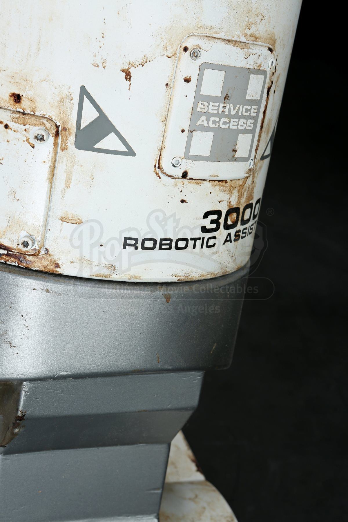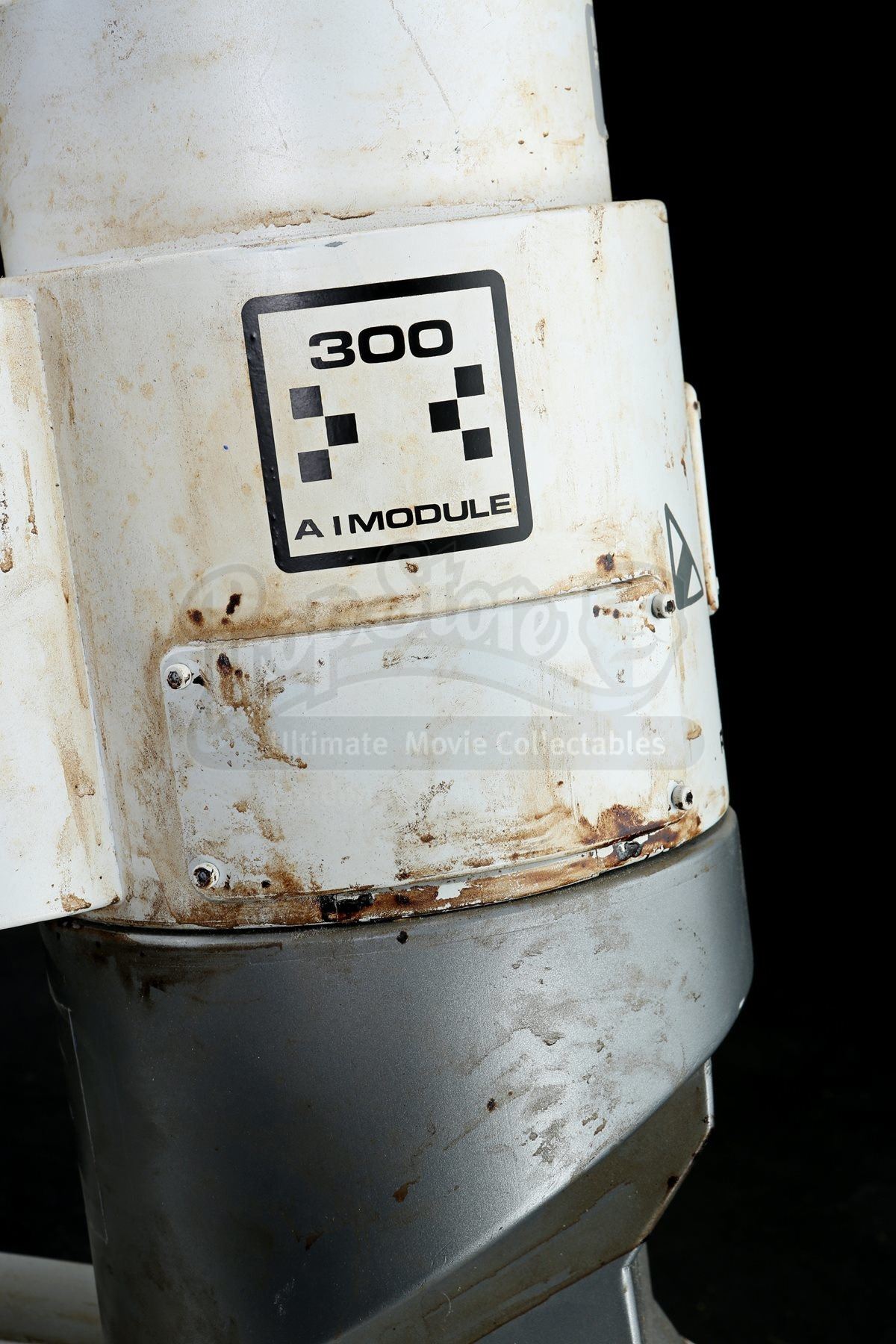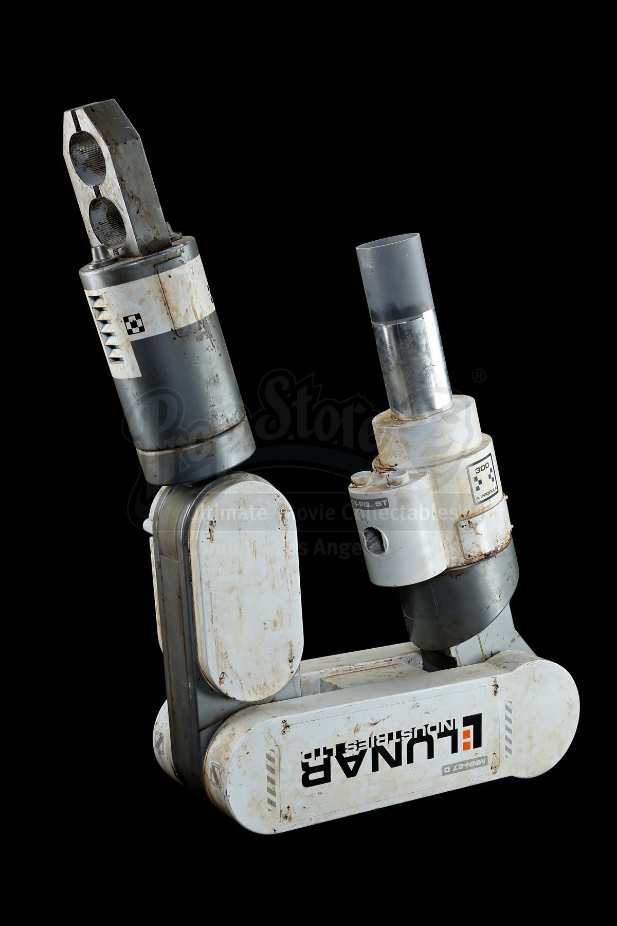 This robotic arm is made of hollow plastic, with faux access panels and two points of articulation for the arm. The piece is painted white and grey in colour, with faux dirt applied throughout, giving the piece a grimy, distressed appearance. The GERTY arm is decorated with sticker decals and shows the “LUNAR INDUSTRIES, INC.” logo on both sides of the upper casing. The lot shows minor wear due to production use, but remains in very fine condition. Dimensions: 76 cm x 28.5 cm x 119 cm (30” x 11 ¼” x 47”)