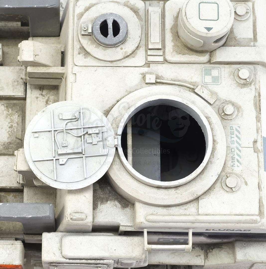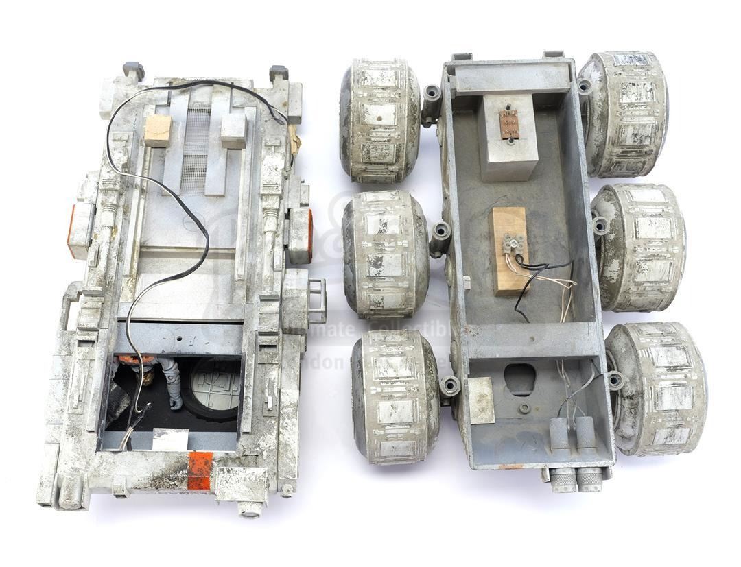 Built by renowned film and television model maker Bill Pearson and his team, this two-part rover model is constructed of resin, plastic, and wood painted white, black, grey, and orange. The top piece features a moveable hatch with a resin Bell half-figure mounted inside and rubber-coated wiring connected to an LED headlight. The bottom piece features six wood and resin wheels with two headlights wired to an electronics pack concealed in the centre. Adhesive decals reading "Lunar Industries", "Mind Step", and "01" are affixed throughout. This model is in good overall condition with grime intentionally applied throughout to simulate moon dust, chipped resin and scuffed paint, and wiring cut by production. Dimensions: 42 cm x 22 cm x 26 cm (16 1/2" x 8 3/4" x 10")