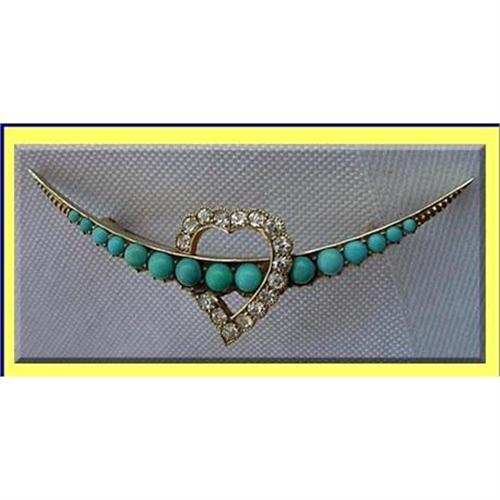 Gold crescent slither of a moon with tiny raised jewels in gold at either end. Set with gradated cabochon turquoise gems. A heart, entirely made of diamonds is 'looped' around the moon. Clearly a marvellous romantic gift in a chivalrous age. The back has engraved hallmark 18CT.
