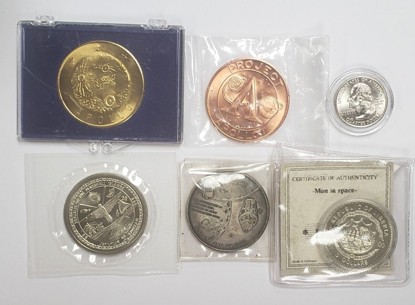 APOLLO VIII 1968, APOLLO XI 1969, COPPER  APOLLO XI 1969, FIRST MAN ON THE MOON 1989  MARSHALL ISLAND & REPUBLIC LIBERIA $5, 2002  OHIO STATE QTR