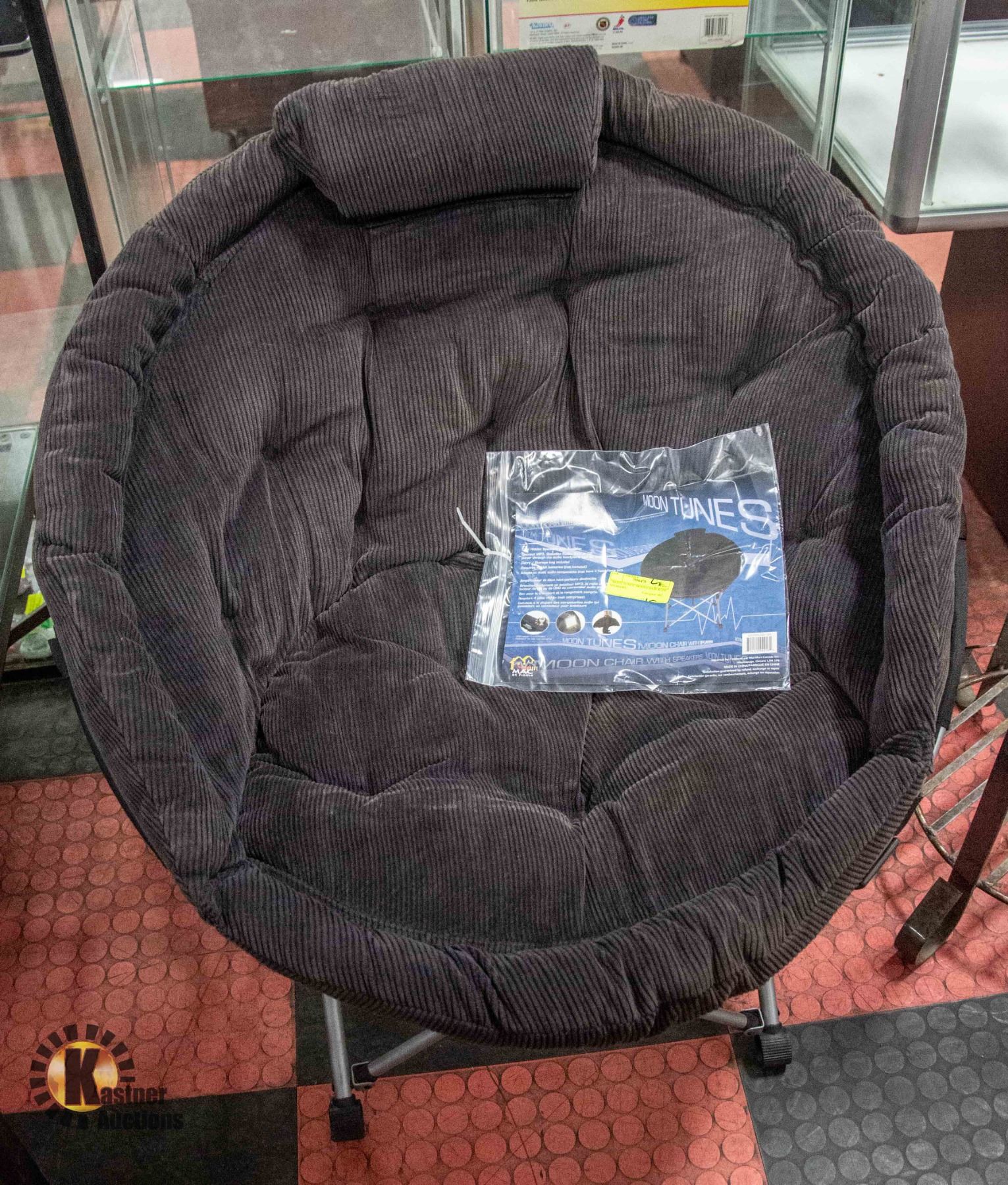 QUICK/EASY FOL-UP AND EASY CARRY, CHARCOAL CORDUROY FABRIC WITH HEADREST, STURDY ALUMINUM FRAME (36"-DIAM. X 35"H) **ALL ITEMS MUST BE REMOVED BY 5PM SATURDAY, APRIL 22ND, 2023. ALL REMAINING ITEMS WILL BE SUBJECT TO A $6.00 PER DAY STORAGE CHARGE. ANY ITEMS REMAINING AFTER MONDAY, MAY 8TH, 2023 WILL BE CONSIDERED FORFEITED. NO REFUNDS WILL BE ISSUED FOR FORFEITED ITEMS.** TO SCHEDULE A PICK UP APPOINTMENT CLICK HERE
