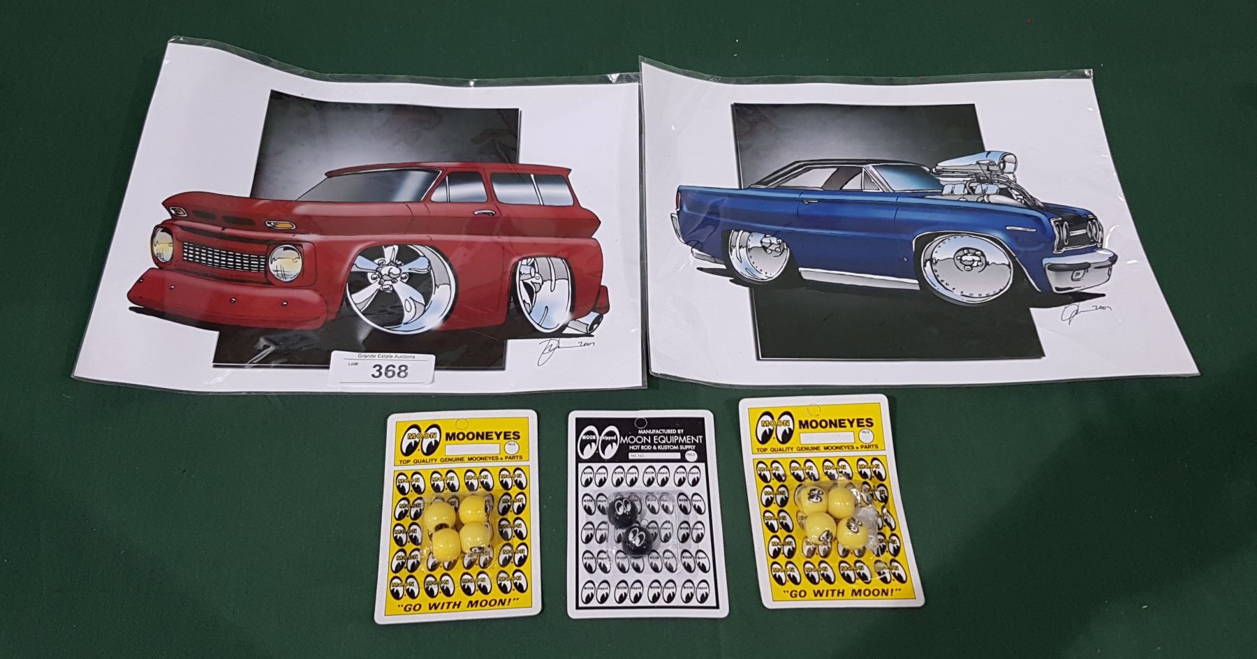 2 SIGNED PRINTS & 3 PACKAGES MOONEYES VALVE STEM CAPS