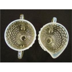 Moonstone creamer and sugar. Footed set. Hobnail opalescent pattern. Made by Anchor Hocking. 3.25" tall. Condition: Excellent