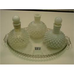 Three Moonstone perfumes on clear tray. Two bottles have stoppers. Tray has all over diaper pattern and 6-lobed handles with lobed "frame". Condition: Chip on one handle and one on rim.