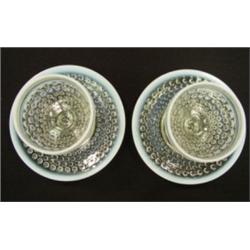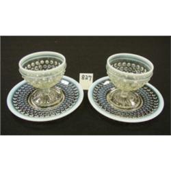 Moonstone sherbets (2) and matching saucers (2). Footed sherbets are 3.5" tall and 3.5" wide. Saucers are 6-3/8" wide. Condition: Excellent