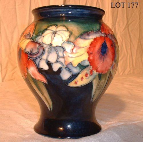 LOW BALUSTER-SHAPE MOORCROFT VASE IN THE "ORCHIDS" PATTERN, MARK POST 1945, 5 3/4" x 4 ½", WEIGHING 1.0 LB.