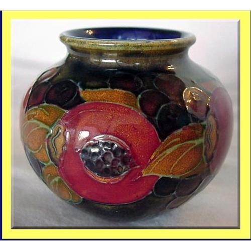 Moorcroft pottery vase with pomegranate & berry decoration on a cobalt ground. Made in England 1930-49.<BR>Measures approx 3 inches high.<BR>ROund shaped vase. Very deep, earthy colours. Tupe lined fruit and foliage decoration. Beautifully painted pomegranates. Colouring is marvellous with wide ranging tones of blues, purples and reds. <BR>Original paper lable underneath with W Moorcroft signature and Potter to H.M. the Queen, under a Royal Coat of Arms.<BR>Excellent condition with no chips/cracks/damage.