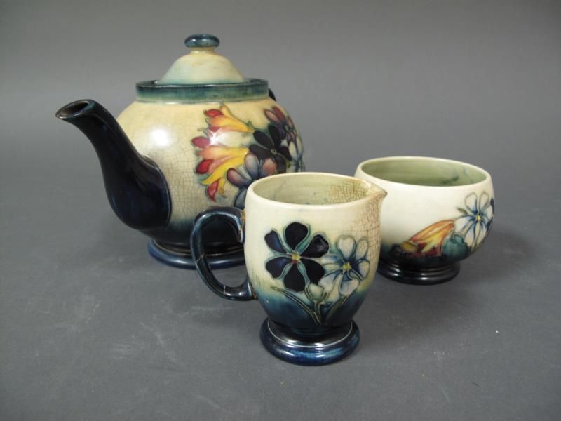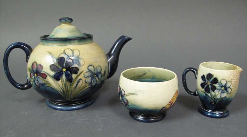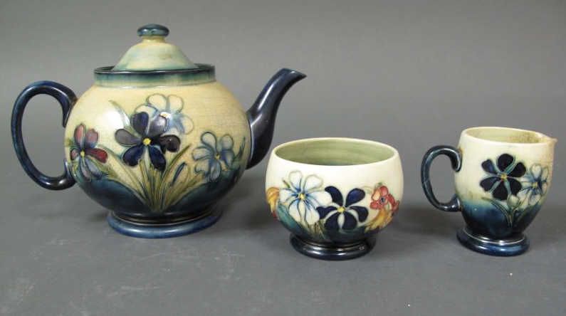-comprised of Spring Flowers pattern teapot, sugar and creamer. All signed, with impressed marks. Chip to spout of creamer and to lid of teapot.