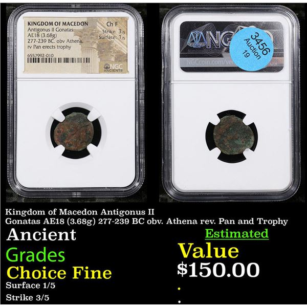 NGC Kingdom of Macedon Antigonus II Gonatas AE18 (3.68g) 277-239 BC obv. Athena rev. Pan and Trophy Graded Choice Fine By NGC. The Slabbing Alo