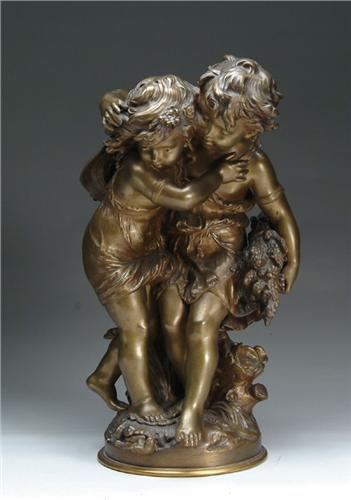 MOREAU BRONZE. Fantastic bronze by Auguste Moreau depicts two children embracing. One child is carrying a bundle of flowers in one arm and the other child has a sun hat hanging on her back from string around her neck. Bronze has nice golden brown patina and is signed on base "Auguste Moreau" and numbered on back of figure "5124". Sculpture is mounted on a black and white revolving marble stand. SIZE: 21 in. t. CONDITION: Very good to excellent. 5-71325