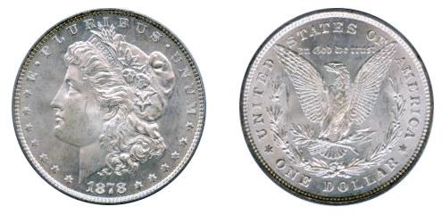MORGAN DOLLAR. 1878. Eight Tail Feathers. PCGS graded Mint State-64. Brilliant.