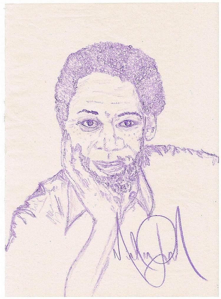 A drawing of the actor Morgan Freeman. Drawn in purple crayon and signed by Michael Jackson. 15x11 inches