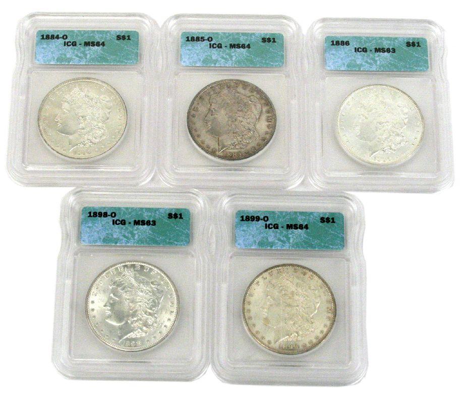 Excellent lot of ICG graded Morgan dollars with 1884-O MS64, 1885-O MS64, 1886 MS63, 1898-O MS63, and 1899-O in MS64