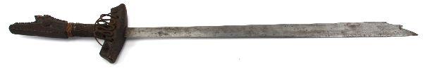 Kampilan with 27 inch blade with carved carved wrapped handle and ornate wood and metal guard. Late 19th to early 20th century. Very good condition.