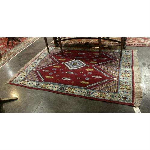 CARPET: Moroccan carpet of hand knotted wool woven on a cotton warp measuring 6.8 x 4.11, medallion pattern deep red color.