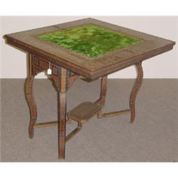MOROCCAN INLAID FOLDOVER GAME TABLE, first quarter 20th century, inlaid with mother-of-pearl and exotic woods; 32 inch height; 33 inch length; 33 inch extended width (losses)