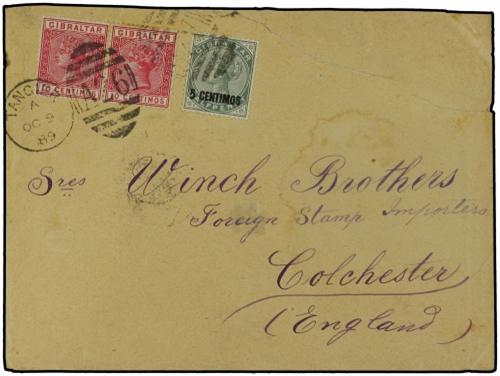 1889 (Oct 9) Cover from Tangier to Colchester franked by August 1889 5cs. on ½d. green and earliest recorded usage of Oct 8th 1889 10c. carmine pair tied by Tangier/A26 duplex. Cover tear at upper right but an important cover. SG 15,23.