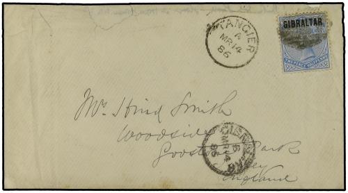 1886 (March 14) Cover to Surrey with Gibraltar first issue Jan 1886 2½d. ultramarine tied by single killer in black (only in use March-April 1886 in Morocco) with superb Tangier cds at left and Gibraltar cds dated the same day in black. London and Redhill/Station Office cds on reverse. Some edge wear but believed to be the earliest known usage of a Gibraltar stamp in Morocco. SG 4.