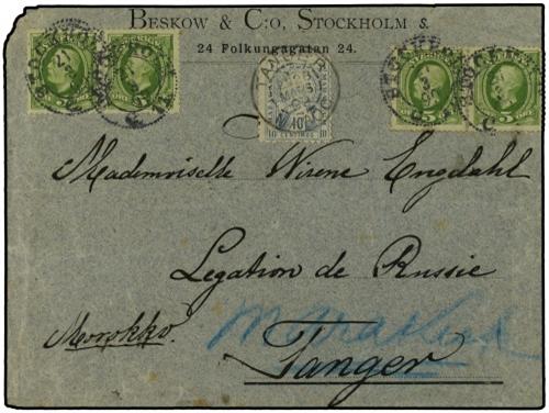 1899 (March 21) Cover from Stockholm to Russian Consulate in Tangier franked by four 5ö yellow green, readdressed to MARAKESH on arrival and franked by Mazagan/Marrakech 1893 10c. blue tied by Tanger/Maroc cds. A very rare usage. Ceres 49b.