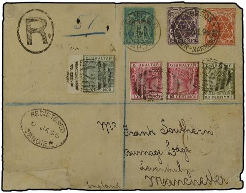 1896 Registered cover to Manchester with 1896 Tanger & Arzila Local Post 5c. purple and 10c. red tied by Tanger cds, French PO 5cs. on 5c. green tied Tanger cds, and Gibraltar 1889 5c. green, 10c. carmine (2) and 20c. olive all tied by A26 obliterators. Some envelope faults but an attractive combination. SG 22,23,24. Ceres 122,123.
