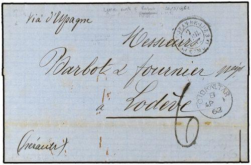 1862 RABAT a FRANCIA. Circulada por via Gibraltar y España. Fechador pequeño de Gibraltar y tasa francesa de ´6´ decimas.