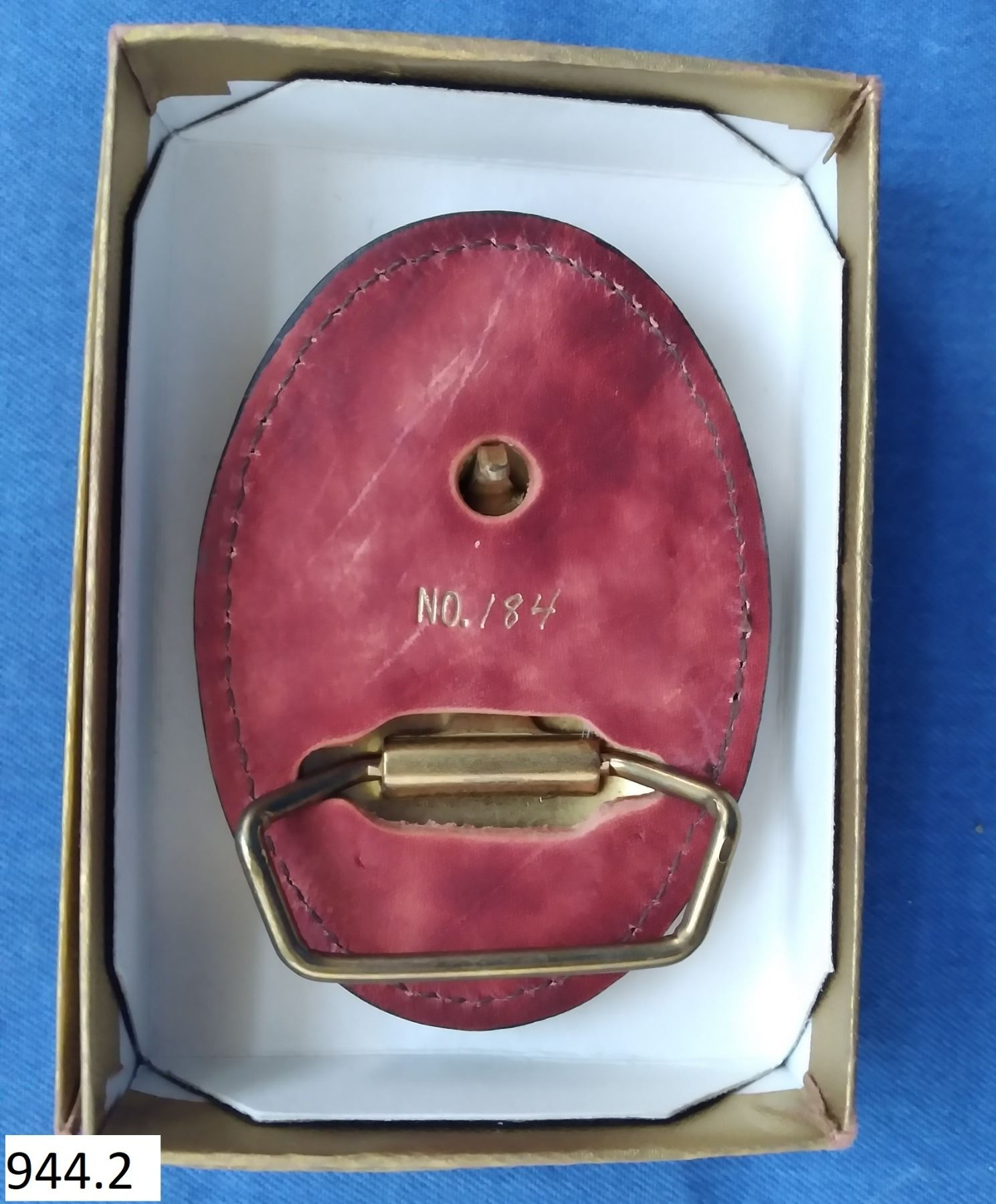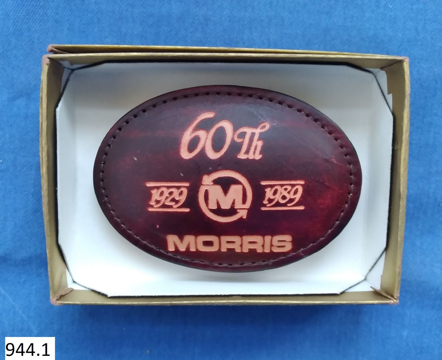 MORRIS 60th. Anniversary Belt Buckle, in original presentation box. Commemorating 60 years of service, 1929-1989. Leather-covered brass buckle. "No. 184" marked on back.