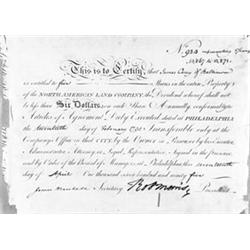 (1734 - 1806) Signer of the Declaration of Independence, financier and politician. Morris was instrumental in the financing of Washington's armies, and was later financially ruined through his speculation in western lands. Partly-printed D.S. "Robert Morris" as President of the North American Land Co., 1p. sm. folio, Philadelphia, Feb. 20, 1795, a certificate issuing five shares in the company to one James Greenleaf, co-signed by JAMES MARSHALL at bottom. In very good condition, with a bold signature with no ink erosion, a few chips in the blank side margins. Suitable for framing.