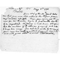 (1734 - 1806) Signer of the Declaration of Independence, financier and politician. Morris was instrumental in the financing of Washington's armies, and was later financially ruined through his speculation in western lands. Fine and desperate content A.L.S. 1p. oblong 8vo., [Philadelphia], May 2, 1798 and marked "No. 1". Writing from debtor's prison, to John Nicholson who adds a short unsigned endorsement on verso, Morris writes in full: "Your No. 6 of the 39th April tells me that you were still without the Papers from Messrs. Neklin [?] & Grifith. I hope you have got them now for Mr. Thronton begins to Goad with notes to be dispatched. Chr. Young is not there. I hope that the exertions of D. Allison & myself will hope to keep him away. You had best write to Mr. Granch you owe him nothing - which I cannot say is the case with your obedt. Servant Robt. Morris." WILLIAM THORNTON (1759 - 1828) was one of the commissioners of the City of Washington to prepare the city for the arrival of Congress from Philadelphia and one of the principal architects of the U.S. Capitol. Morris borrowed heavily on land he owned in Washington D.C. in order to purchase western lands. Heavy chipping at margins, resulting in the loss of a few words at the extreme top right, light soiling and creases, overall very good condition.