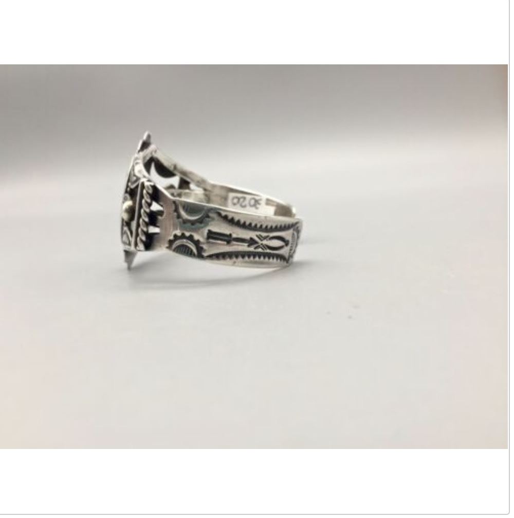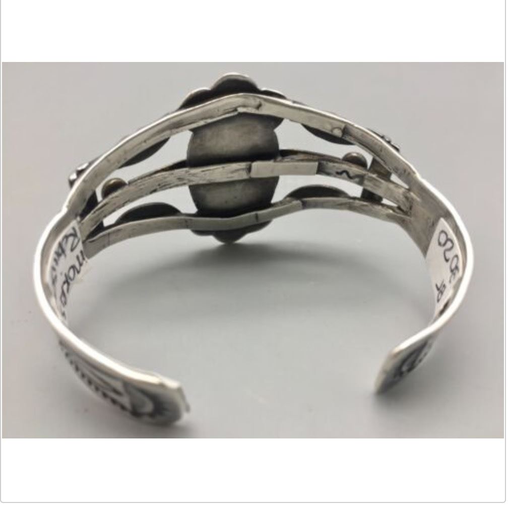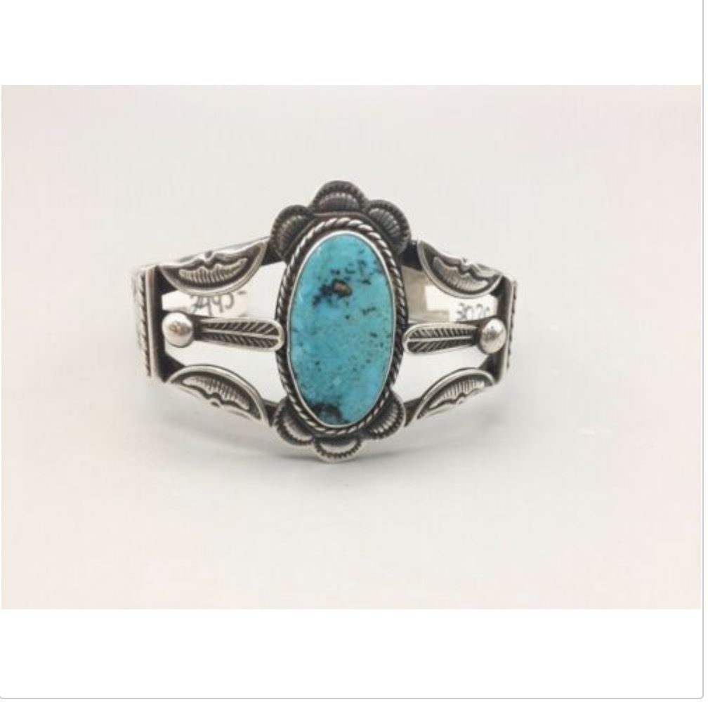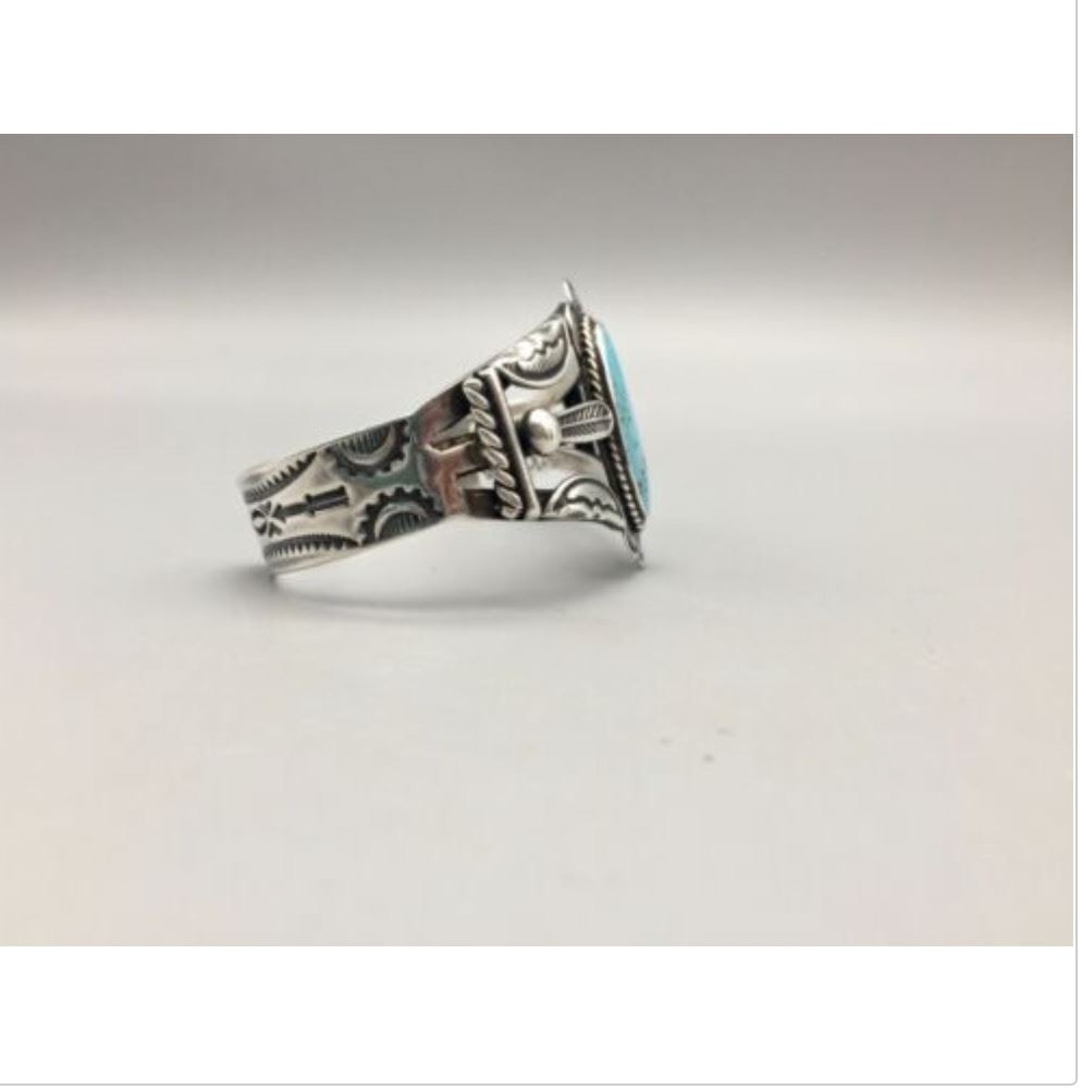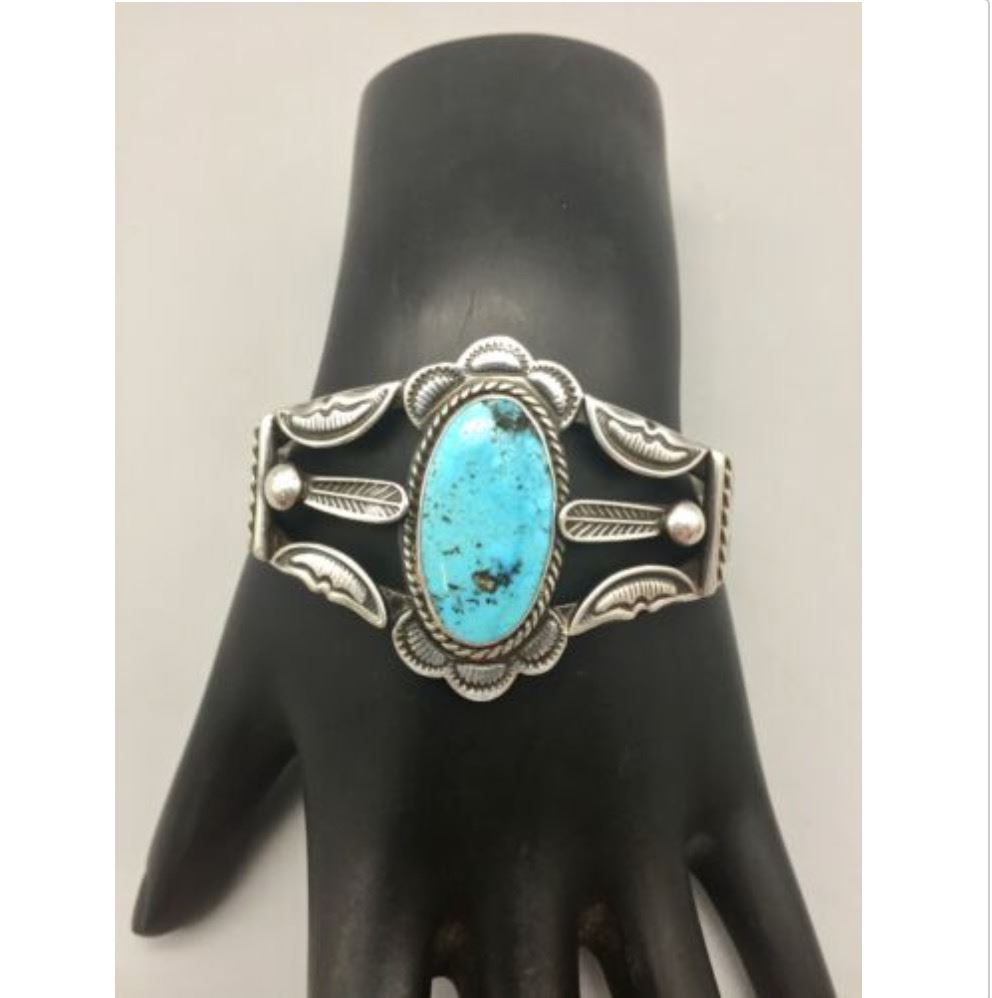 Description: Highly sought after, collectible artist, MORRIS ROBINSON!!! Exquisite, sterling silver cuff bracelet with an old, natural turquoise stone and hand stamped silver work. Tested as Sterling Silver. Maker: Although there is an old repair that obliterated part of the hallmark, the snake symbol portion of Morris Robinson's (1900-1987, Hopi) mark is still clearly there. Also, the workmanship speaks for itself. Approx. Age: Circa mid-century. Size: Inside circumference measures 5 3/4 inches plus there is a 1 inch opening (making this bracelet fit an approx. 6 3/4 inch wrist). It measures 1 1/2 of an inch at its widest point. Weighs 36.6 g. Condition: Vintage, fair. Normal wear expected and there is evidence of an old repair on the backside. Bracelet is solid now. Please look closely at our pictures as they are an important part of our description. Shipping: There will be a $5 handling / packaging fee for shipping this lot. The actual cost of postage will be added on top of that. BUY IT NOW: If you would like to buy this item now without waiting for the auction to end (this option is only available up to 48 hours before the auction starts to close), the “Buy it Now” price is the high estimate of this lot. If you would like to end the auction early and pay the high estimate (plus applicable fees), please contact us by phone or email and reference this lot.