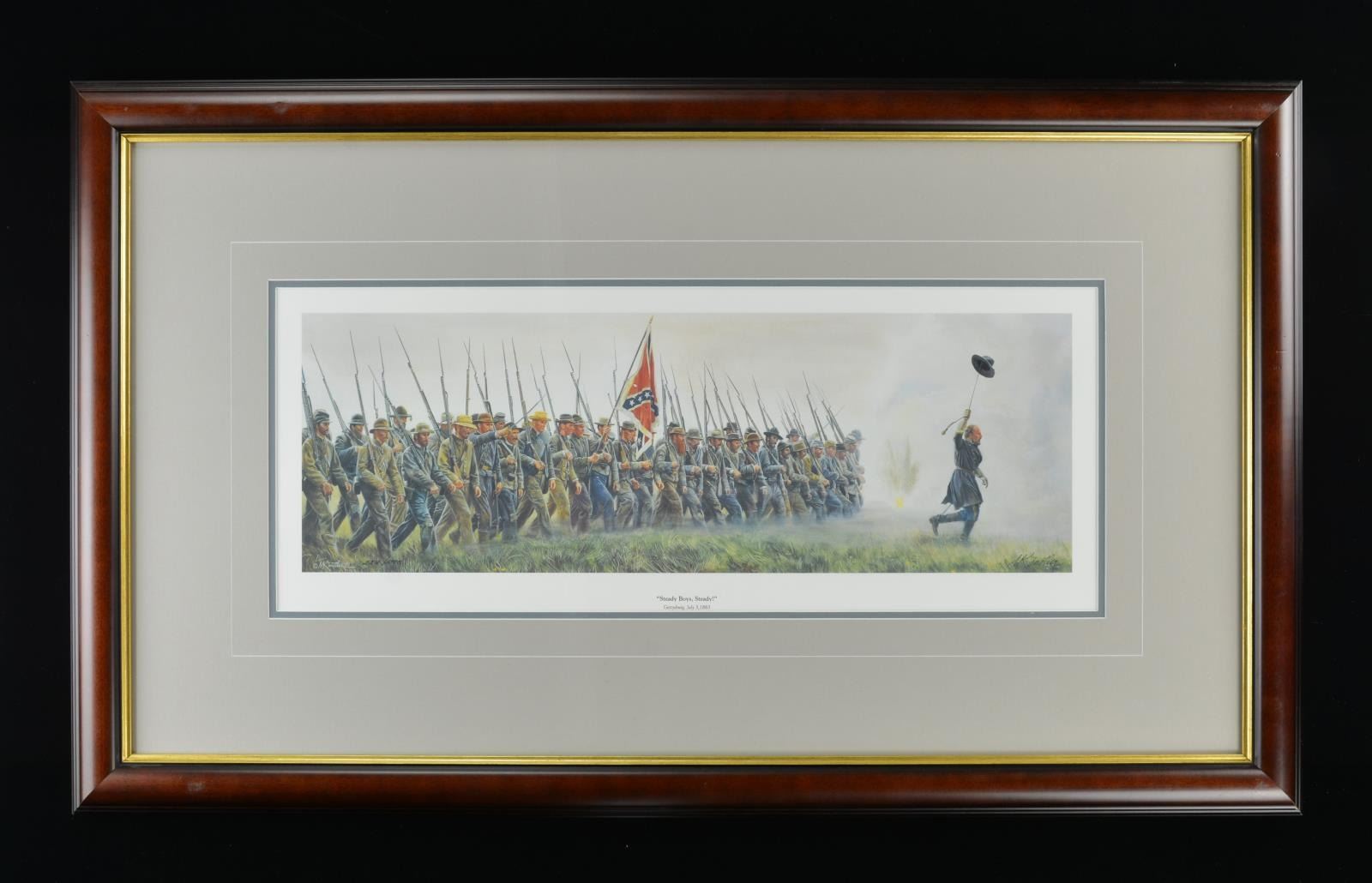 GETTYSBURG JULY 3, 1863" FRAMED L.E. PRINT. 40” x 24” framed. 1993, signed & numbered limited-edition print "662/1750". CONDITION: fine overall. PROVENANCE: The Cullen Smith Estate Collection. (02-17291/JS). $200-300.