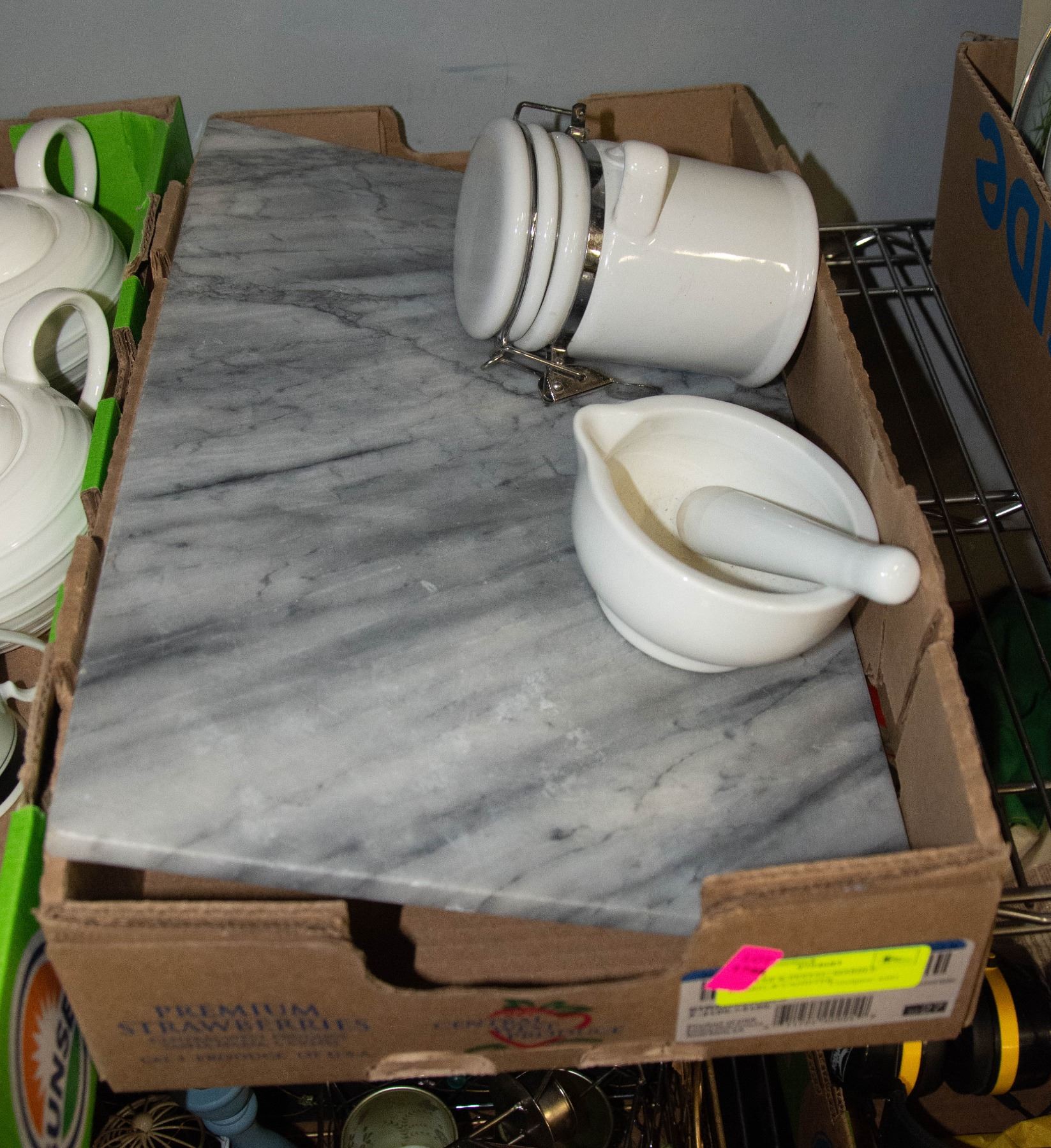 MORTAR & PESTAL, MARBLE BOARD, & CANISTER