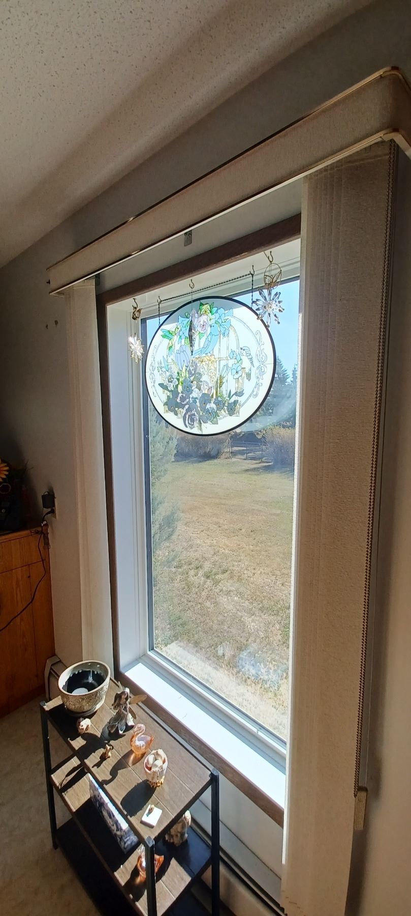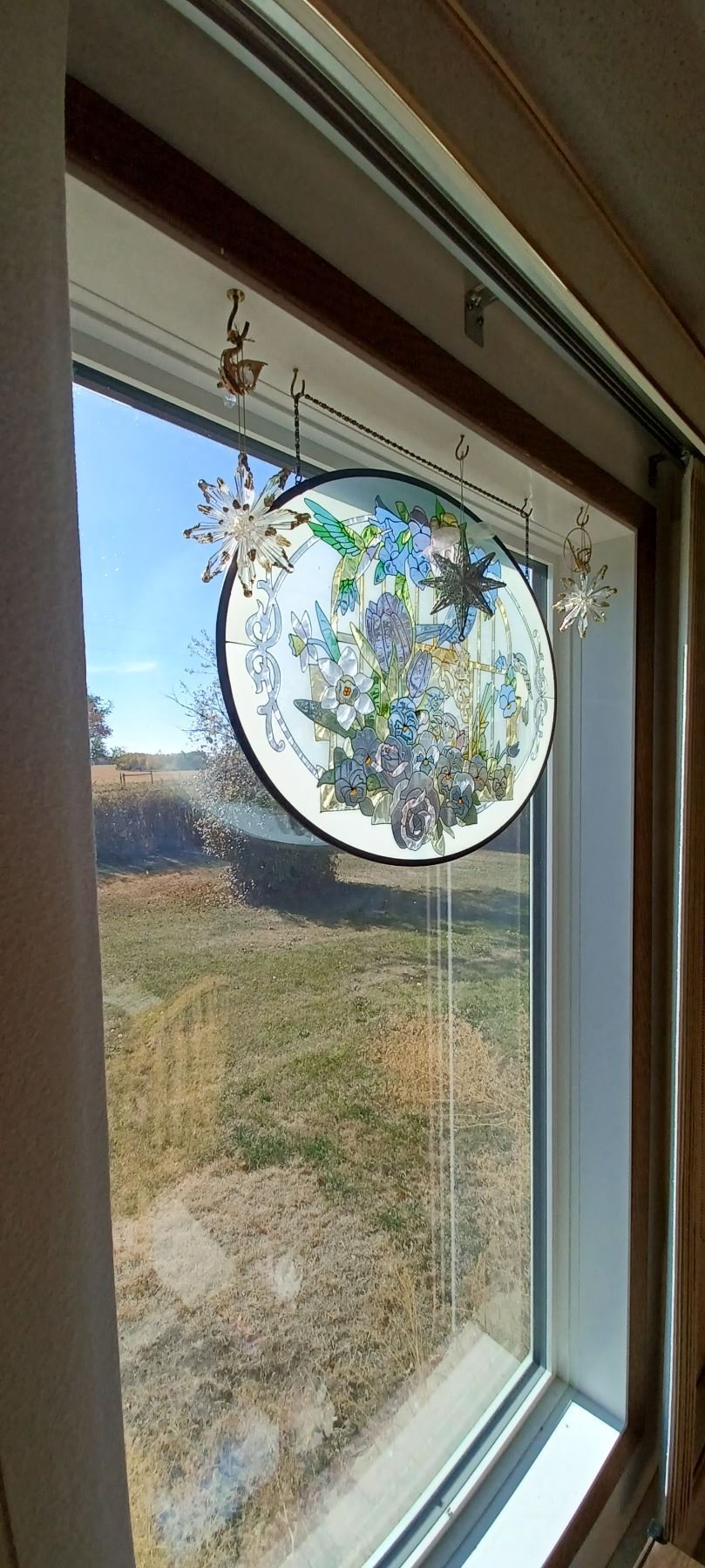 MOSAIC IRON FRAMED STAINED GLASS, WINDOW CRYSTALS AND CONTENT ON SHELF PLEASE SEE IMAGES