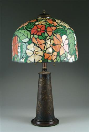 MOSAIC TABLE LAMP. Contemporary mosaic shade has orange, yellow and white flowers against a green leaf background. Shade rests atop a period lamp base with light reposse flowers against a textured background. SIZE: Shade is 17 in. dia x 10-3/4 in. deep. Overall height is 29-1/2 in. CONDITION: Shade has several cracked panels and several areas of solder repair. Base has extended riser to accommodate shade and shows some wear to finish. Estate of Edwin Schiebel Sr. 5-60001