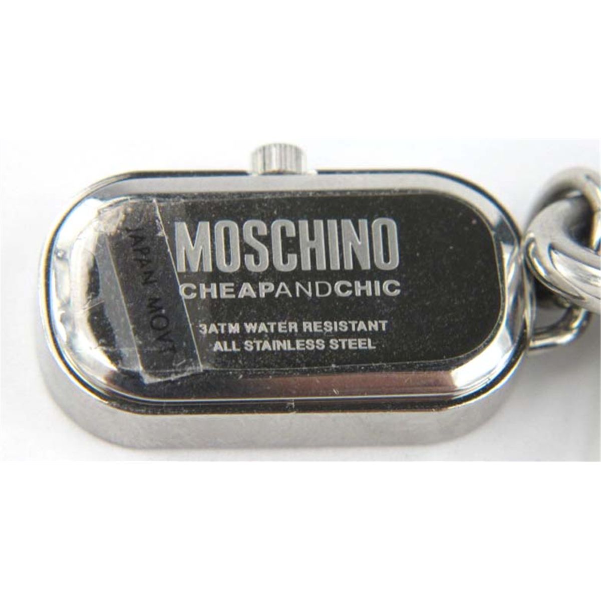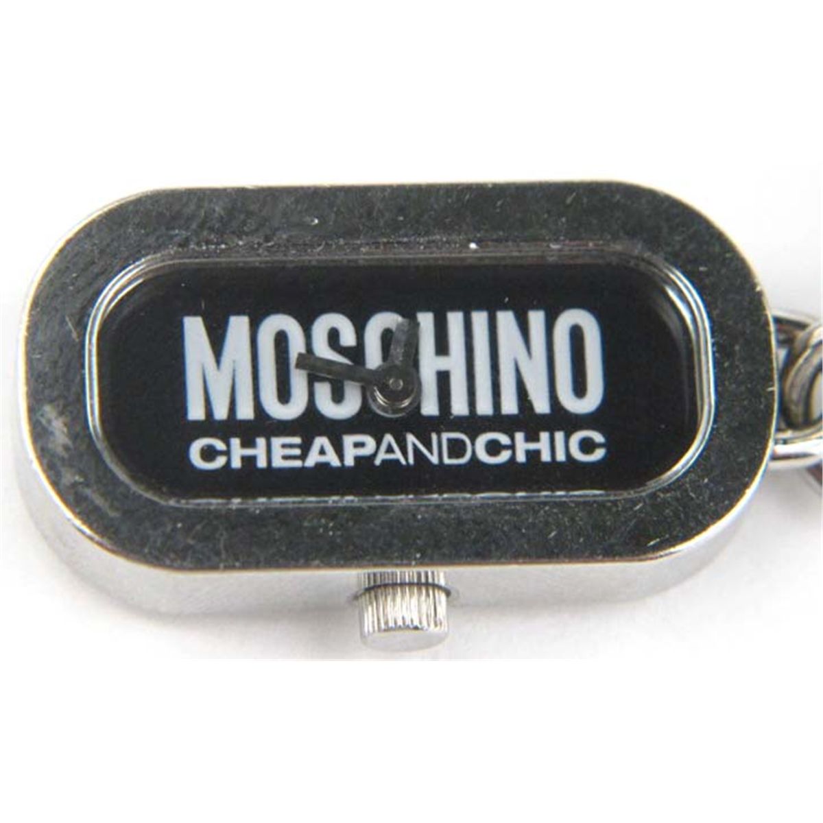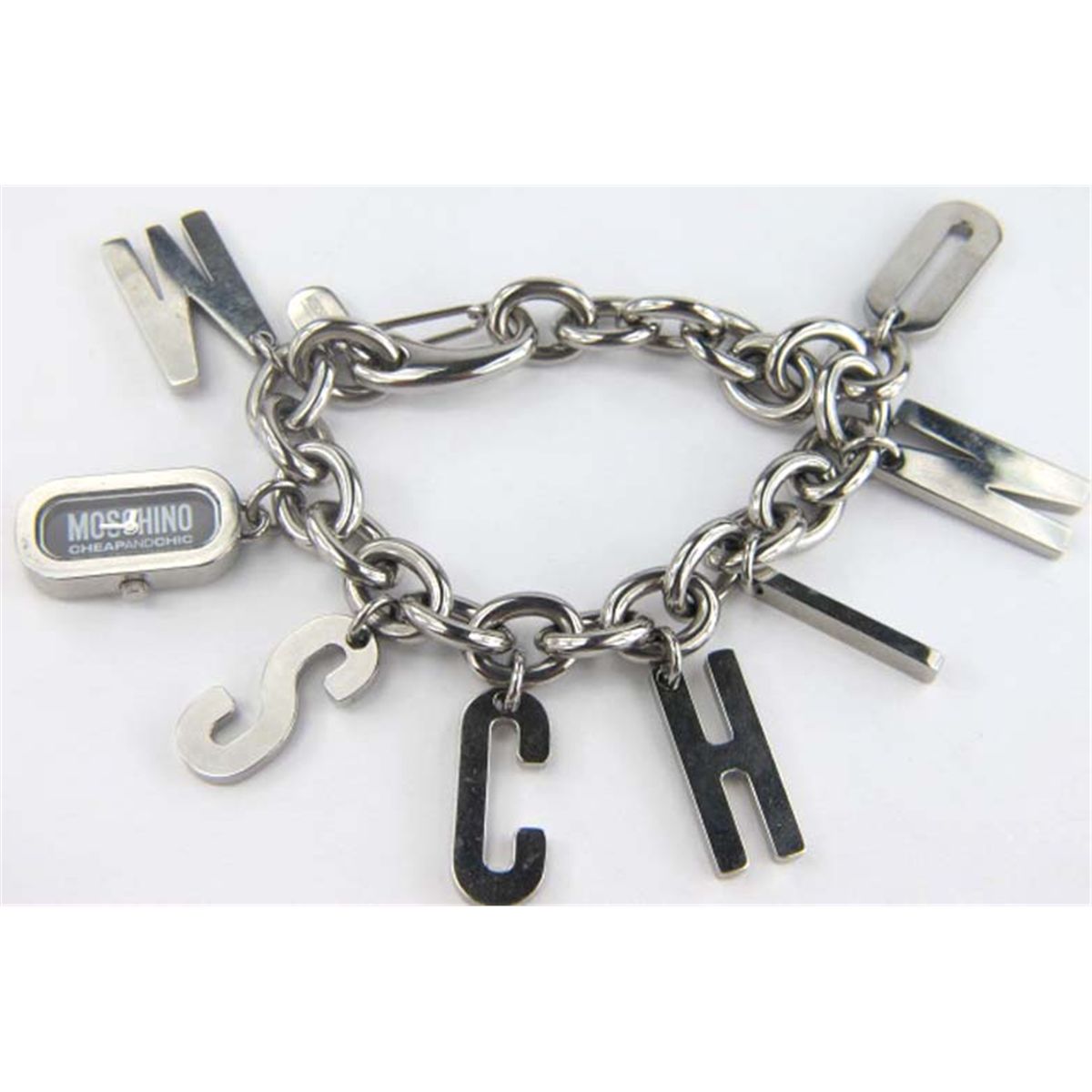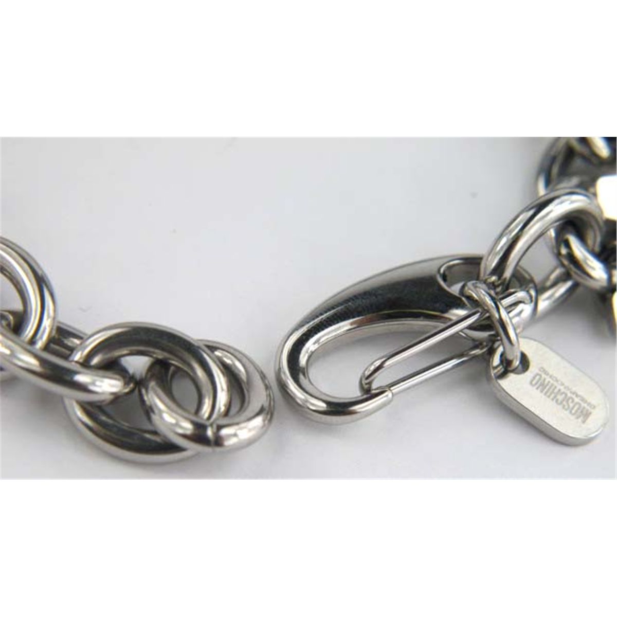 MOSCHINO Silver charm bracelet. The total weight of the bracelet is 82.3 grams. The length of the bracelet is 8 inches. The thickness of the bracelet is 12mm and 3mm wide.