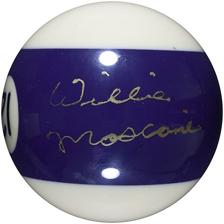 (1913 - 1991) American billiards champion and trick-shot specialist, considered one of the greatest pool players. A neat Mosconi item, an official size and weight number "12" pool ball boldly signed in full by Mosconi in gold sharpie. Very good. From the Goldberg sale of Mosconi's personal effects consigned by his widow, Flora Mosconi, April, 2005.