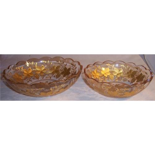 SMALL-1 2/3''T X 5 1/3''W-LARGE-1 3/4''T X 6 1/3''W 2 BEAUTIFUL MOSER BLOWN GLASS FRUIT BOWLS W/EXQUISITE WHEELCUT AND HP GOLD GRAPE DESIGN, CUT, SCALLOPED,GOLD PAINTED RIMS AND GROUND BOTTOMS W/THE SAME DECORATION-CA.1890'S.NEAR MINT W/ONLY A VERY FEW LIGHT SCRATCHES AND MINOR LOSSES TO GOLD.SHIPPING WT.IS 3 LBS.