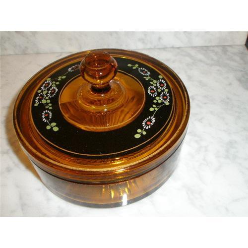 <tr><td>Type: AMBER COLOURED GLASS /TRIMMED W/FLORAL PATTERN.</td></tr>