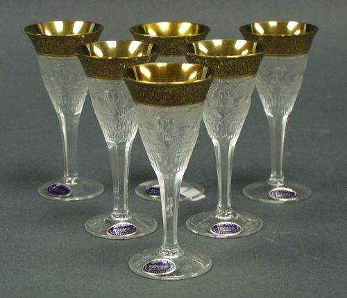 MOSER - CZECHOSLOVAKIA. A lot of 6, tall gold banded cut crystal footed liquor glasses in the "Splendid" pattern. Each piece engraved with stylized "R" initial. 4" high, top 1 3/4" dia. Hallmarked. Never used, packed in original display boxes. Exhibited a