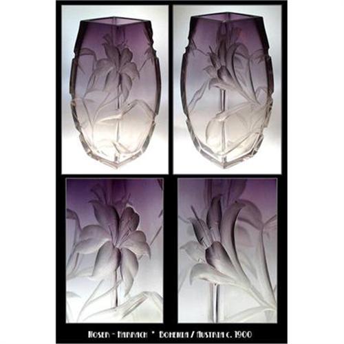 Gorgeous floral (Iris?) hand engraved vase. The color gradually changes from crystal on the bottom to amethyst on the top. This beautiful vase is typical of MOSER or HARRACH c. 1900 manufacture. Except "fleabite" on the top rim this vase survived its 100 years of age in excellent condition. Bohemia (which later became Czechoslovakia), dimension : 8 inches high. Comparable pieces are listed in "MOSER Artistic Glass" Edition 2, page 125 and 126 and valued $800-$1200. Don't miss out on this INVESTMENT quality Art glass.