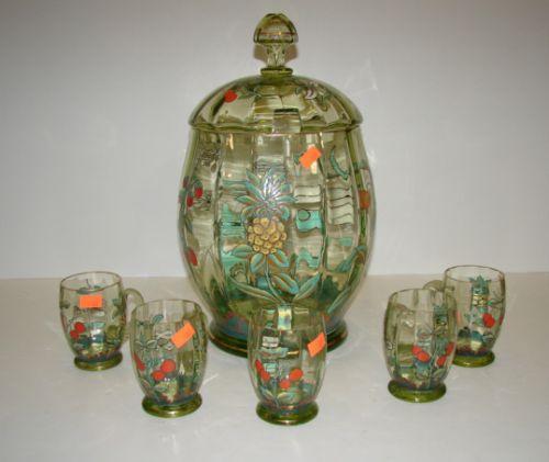 MOSER STYLE CIDER JAR WITH LID & 5 HANDLED TUMBLERS. Decorated with hand painted fruit decoration. Tumblers have applied glass handles. Missing ladle. Cider jar: 15” H. Tumblers: 3.75” H