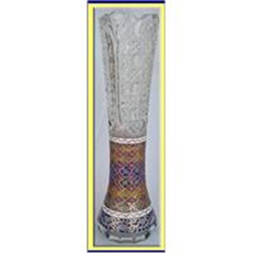 Very rare tour de force of glass techniques in a single vase, made Bohemia by Moser or Fritz Heckert, 19th century.<BR>9 1/4inch high.<BR>Slender, elegant shape divided into sections, each with a different technique and pattern, all of the highest quality workmanship and beautiful design.<BR>The round, faceted, bottom leads to a band of blue enameled glass, cut away to a poppy pattern, with gilded scrolling foliage. Above this, 2 rich white enamel and gold seperating bands contain a very fine cut and coloured complex floral design, in which the polychrome stained glass immitates the complexities of cut glass. The patterns are cut and very finely gilded. Above this, all the way to the top is deeply cut glass, ending in scalloped fan rims.<BR>The area between deep mitres has a very subtle acid etched gilded pattern. <BR>Condition is excellent. No chips/cracks.