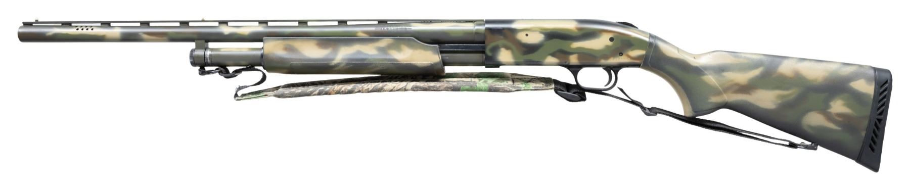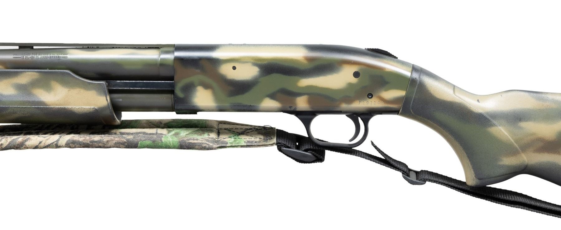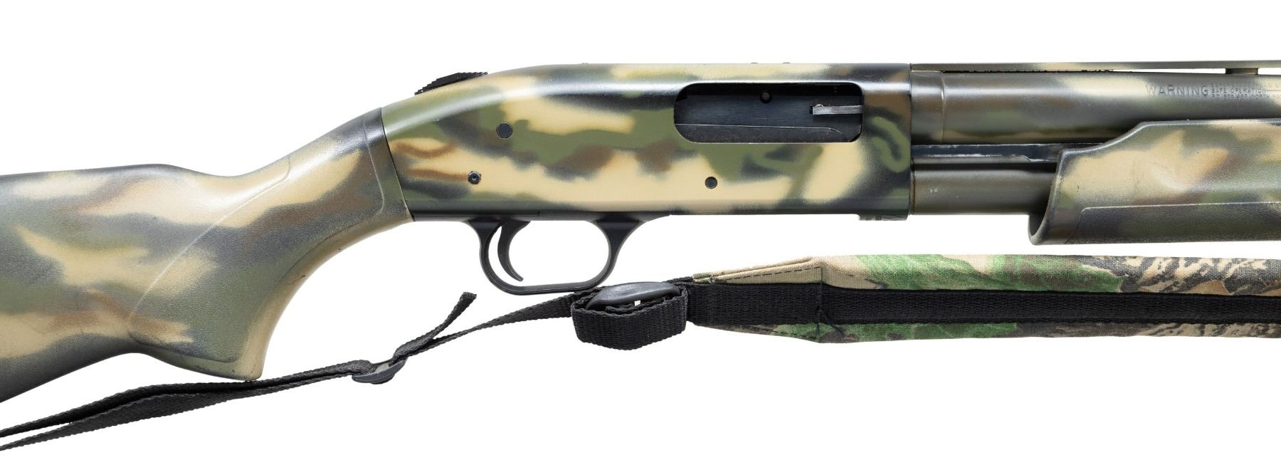 Cal 12 Ga. 3". S# P191149. Bbl. 24" with VR. Bead front sight. Camo finish. Synthetic camo finished furniture with bottom mounted sling swivels, black nylon sling & grooved black recoil pad. LOP: 13 3/4". UNATTACHED ACCESSORIES: unnumbered factory box with manual & trigger lock. CONDITION: metal & furniture show scattered handling marks, operational wear, some light flaking & notable dings with finish loss on front of mag tube. Action is functional when hand cycled but mag tube has orange block that is preventing loading. Very good bore. (25-4813/MJC). MODERN. $300-400.