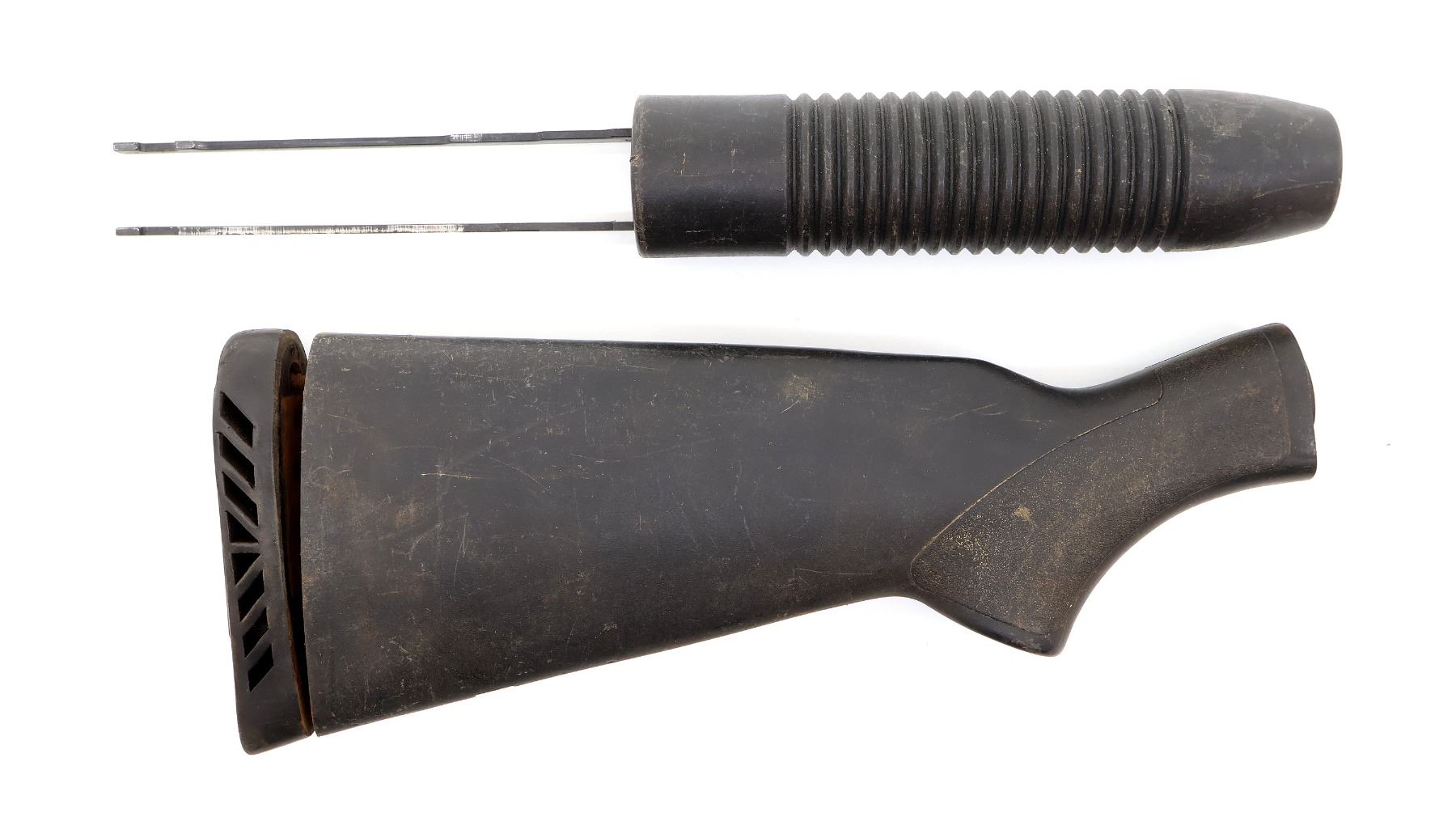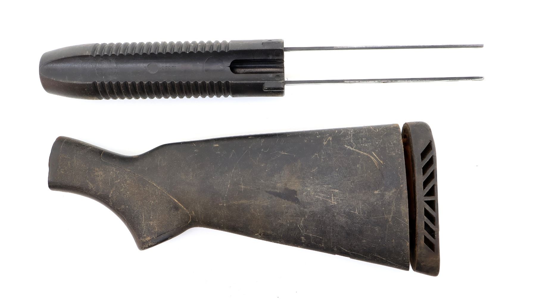 LOT INCLUDES; (1) BLACK POLYMER BUTT STOCK, TEXTURED, UNMARKED, WITH BLACK RUBBER RECOIL PAD, OVERALL LENGTH APPROX. 12", SHOWS WEAR / TEAR FROM USE & (1) BLACK POLYMER FOREND, GROOVED, UNMARKED, MAY HAVE SMALL CRACKS & CHIPS, OVERALL LENGTH APPROX. 14.25", SHOWS WEAR / TEAR FROM USE. MAY REQUIRE FITTING. SEE PHOTOS.