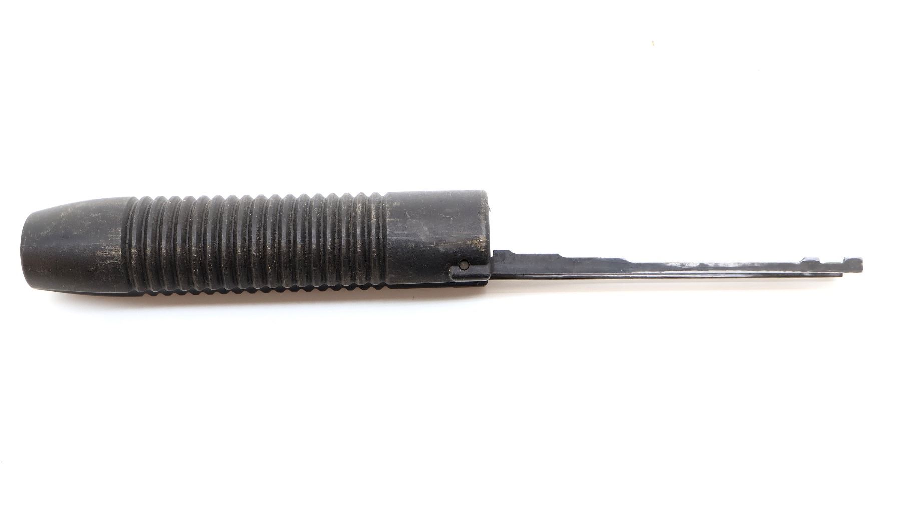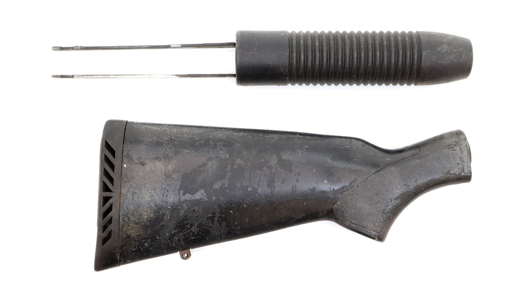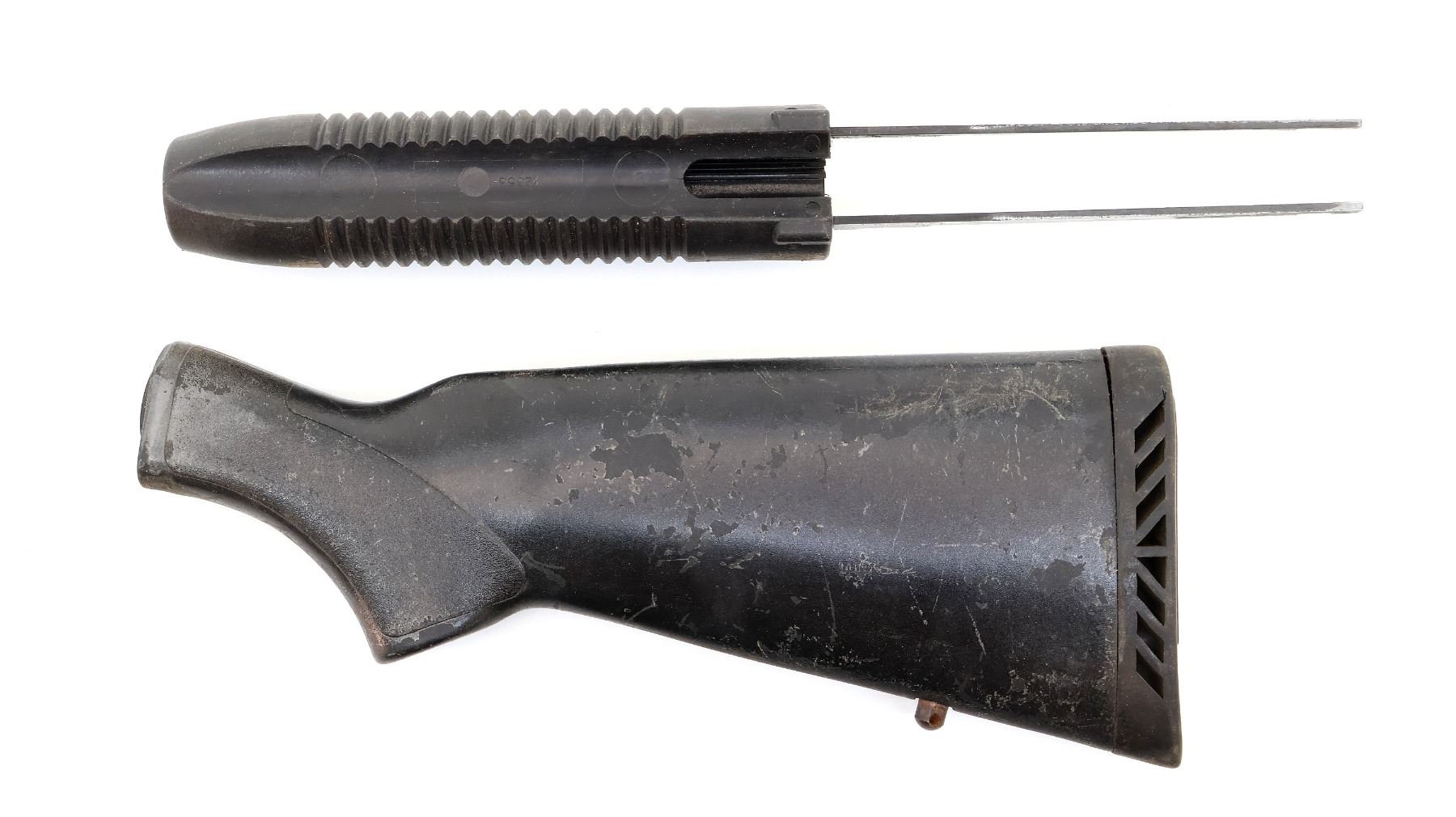 LOT INCLUDES; (1) BLACK POLYMER BUTT STOCK, TEXTURED, UNMARKED, WITH BLACK RUBBER RECOIL PAD & SWIVEL STUD, OVERALL LENGTH APPROX. 12", SHOWS WEAR / TEAR FROM USE & (1) BLACK POLYMER FOREND, GROOVED, UNMARKED, MAY HAVE SMALL CRACKS & CHIPS, OVERALL LENGTH APPROX. 14.25", SHOWS WEAR / TEAR FROM USE. MAY REQUIRE FITTING. SEE PHOTOS.