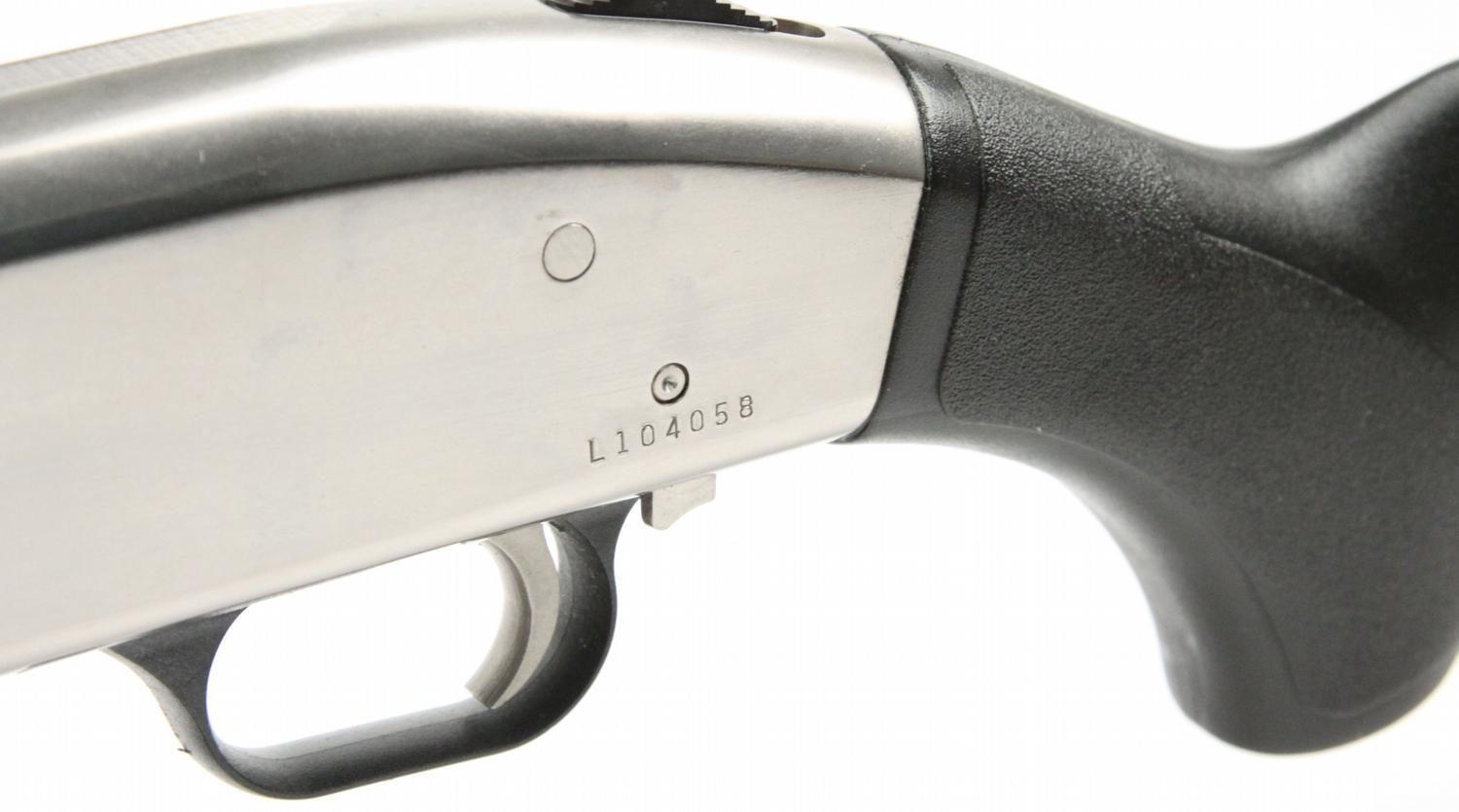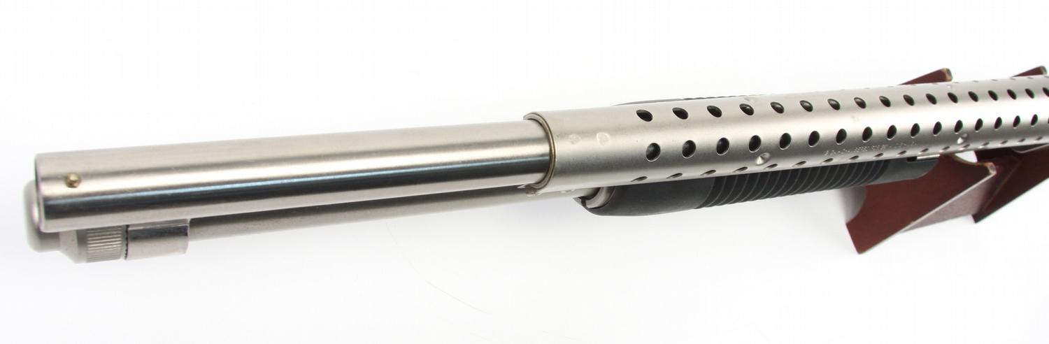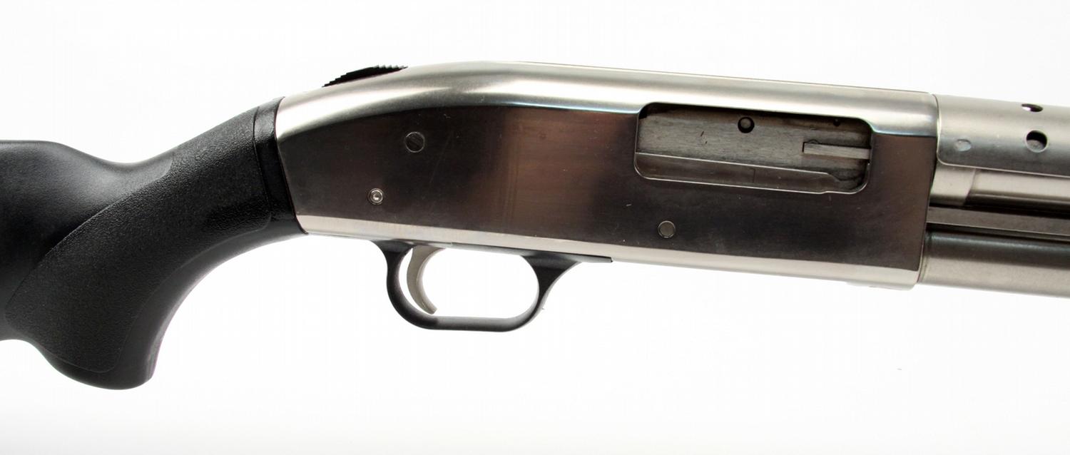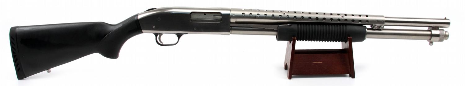 Mossberg Model 590 pump action 12 gauge shotgun. Marinecoat finish, with synthetic stock ventilated heat shield, full length magazine, and alternate pistol grip stock. 20 inch barrel, chambered for 2 3/4 & 3 inch shells. Bore is bright and clean, and finish and stock are excellent. Overall excellent condition. SN: L104058