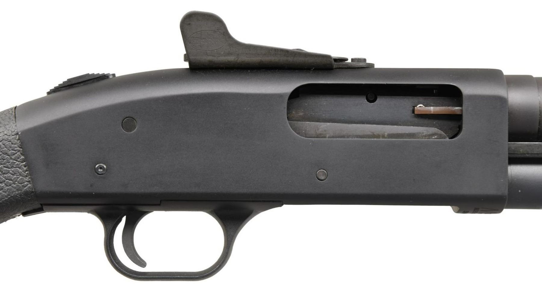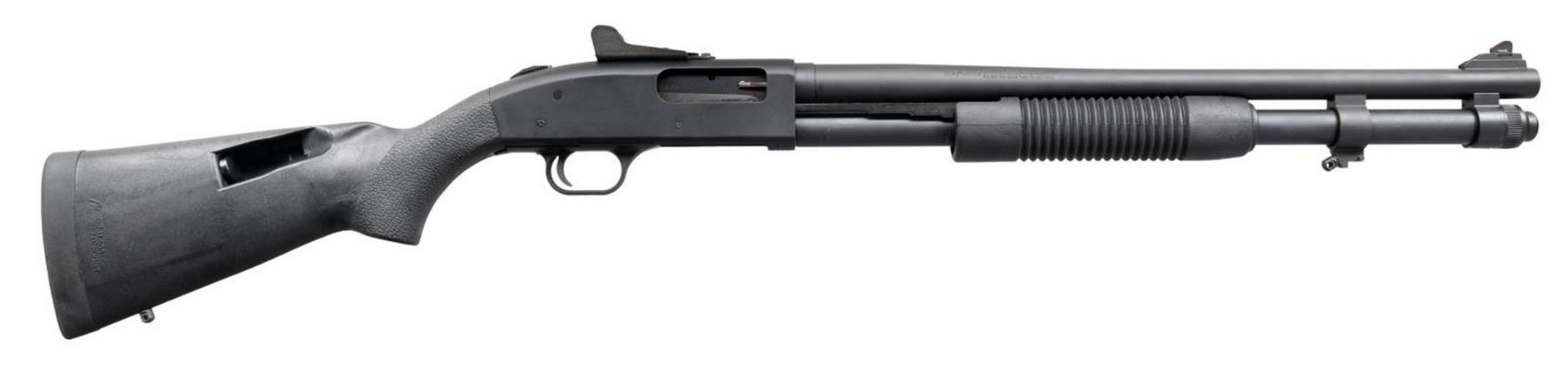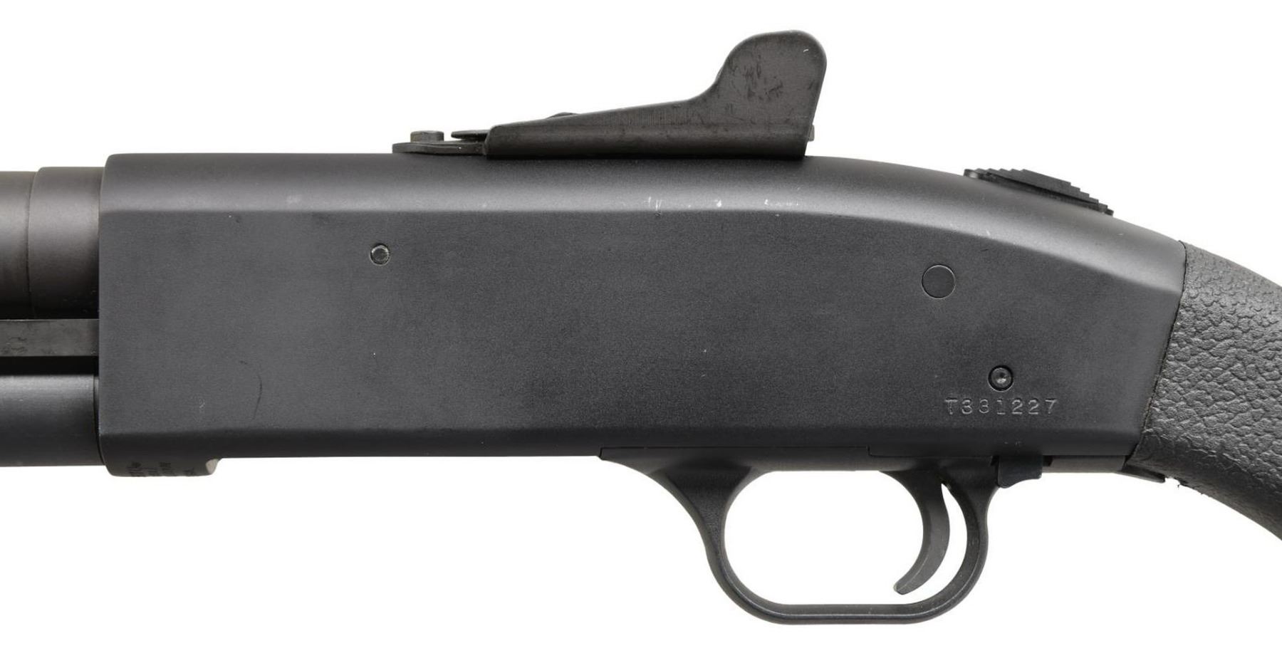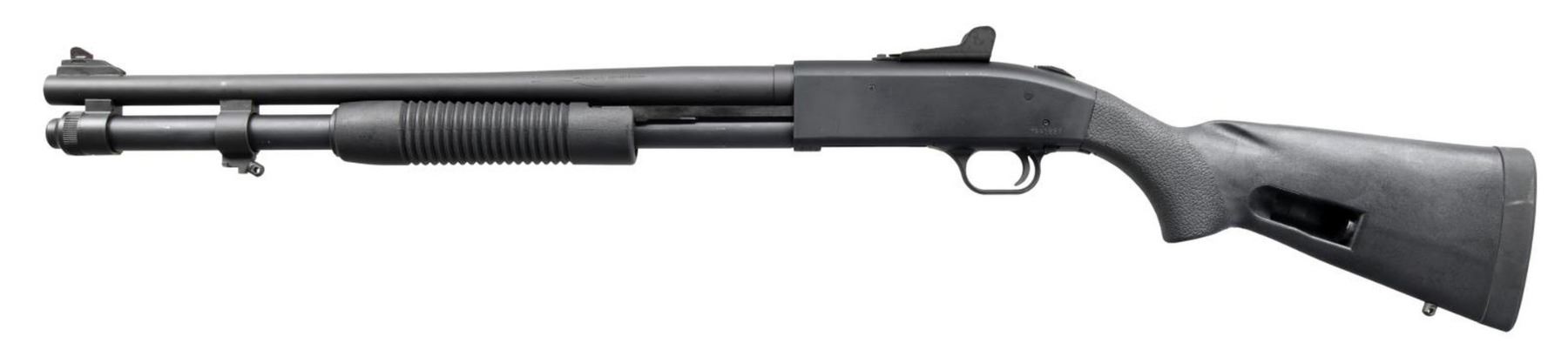 Cal. 12 GA, 2 3/4" & 3". S# T331227. Bbl. 20 3/4". Model 590 pump action shotgun mfg. by Mossberg. Left side of bbl. exhibits the Mossberg trademark logo, followed by the cal. designation. Underside of receiver exhibits Mossberg's mfg. information, and the model designation. Matte black anodized receiver, with matte black finished bbl. and mag. tube. Davis M500 black polymer "Speedfeed" buttstock (holds up to 4 additional rds.), with factory grooved black polymer pump. Ramped orange blade front sight with ghost ring rear sight. CONDITION: metal components retain the majority of their original factory finishes, exhibiting some light wear and some scattered superficial handling marks. Mirror bore. Polymer furniture is very good overall. PROVENANCE: The Collection of Gun Sport Ltd owned by Jon R. Thomas. (23-3817/MLW). MODERN. $300-500.